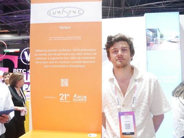 サクレー大学で生まれたスタートアップの一例として、集積フォトニクスを専門とする企業LumiSyncがブース出展していた。データセンターで、ネットワーク内の異なる光データを同期する装置を構築し、同期とデータ転送の速度を向上させ、消費電力を削減し、必要な要素の数を減らしてアーキテクチャを簡素化できると期待されている。航空宇宙、防衛分野のレーダーから量子コンピューティングへの応用も視野に入れている。