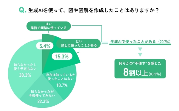 一方で、生成AIで図を作ったことがあるビジネスパーソンは、全体の2割(20.7%)にとどまる。そのうち、8割以上(83.9%)が“不便さ”を感じており、「素案としては使えるが、実際の会議では書き直すことが多かった」(41.1%)、「見た目は整っていたが、自分の意図とは少しズレていた」(34.7%)といった意見が挙がっている。生成AIによる図の作成は、“たたき台”としての活用にとどまっているのが現状だ。