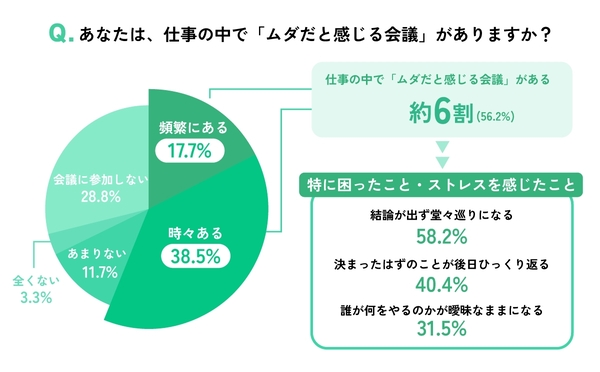 調査では、約6割(56.2%)のビジネスパーソンが、仕事の中で「ムダだと感じる会議がある」と回答。その理由として最も多かったのは、「結論が出ず堂々巡りになる」(58.2%)だった。2位と3位には、「決まったはずのことが後日ひっくり返る」(40.4%)、「誰が何をやるかが曖昧なまま終わる」(31.5%)が挙がり、意思の不一致や共有不足がストレスになっていることが分かる。
