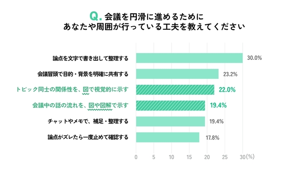 この“ムダ会議”を防ぐために、現場ではどのような工夫がなされているのか。工夫していることとして最も多かったのは「論点を文字で書き出して整理する」(30.0%)となり、「会議冒頭で目的・背景を明確に共有する」(23.2%)が続いた。