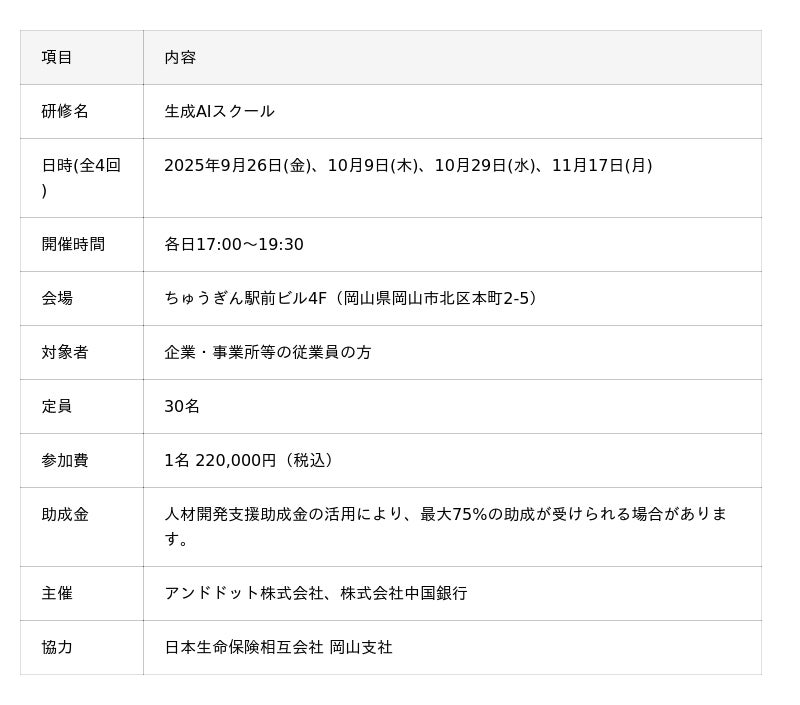 企業向けに生成AIソリューション事業を展開するアンドドット株式会社(本社:東京都渋谷区、代表取締役:茨木 雄太)は、中国銀行(本店:岡山県岡山市、取締役頭取:加藤 貞則)と連携し、日本生命保険相互会社 岡山支社(所在地:岡山県岡山市)協力のもと、岡山県内の企業を対象とした「ChatGPT完全マスター研修」を2025年9月より全4回の日程で開催いたします。
