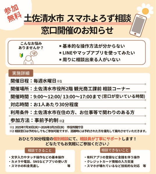 株式会社エージェント(本社:東京都渋谷区、代表取締役:四宮浩二、証券コード:7098)は、2025年5月に高知県土佐清水市と「地域のDX推進に向けた包括連携協定」を締結しています。今回、その取り組みの一環として、同市と協力し、市民のデジタル活用を支援する「スマホよろず相談」ブースを2025年7月30日より土佐清水市役所内に開設いたします。