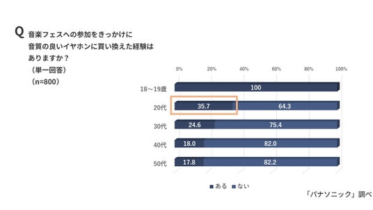 音楽フェスへの参加をきっかけに音質の良いイヤホンに買い換えた経験はあるかを聞いたところ、25.1%が「ある」と回答しました。なかでも20代は35.7%と他世代に比べて最も高く、音楽を聴くことへのこだわりがうかがえます。音楽フェスでの臨場感や良質な音楽体験が、イヤホン選びにも影響していることがわかります。