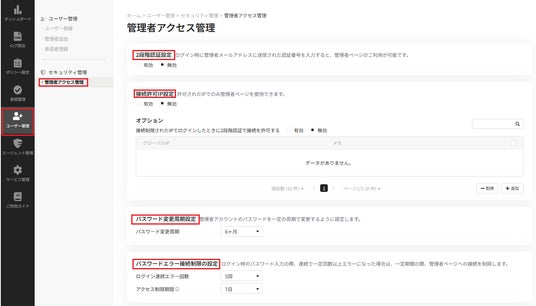 管理者ログインのセキュリティ強化のため、メール認証の追加や許可されたIPからのみ接続を制限することができます。 重要な機能であるため、管理者登録メニューと同じ場所にある「ユーザー管理」のサブメニューに移動し、管理者管理時に見落とさず一緒に確認できるようにしました。