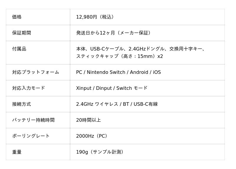 付属品:本体、USB-Cケーブル、2.4GHzドングル、交換用十字キー、スティックキャップx2
