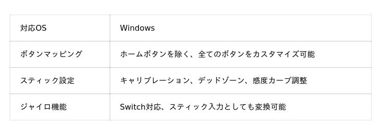 Windows対応の専用ソフトウェアにより、ボタン割り当てからスティック調整まで簡単に設定可能。感度カーブやデッドゾーン調整、ジャイロ機能など、プレイスタイルに合わせた詳細なカスタマイズができます。