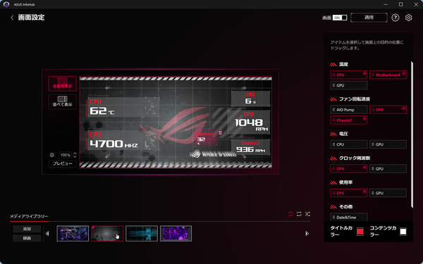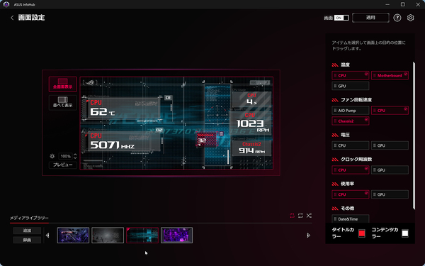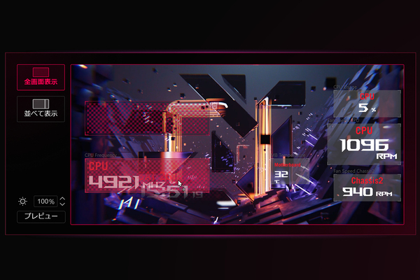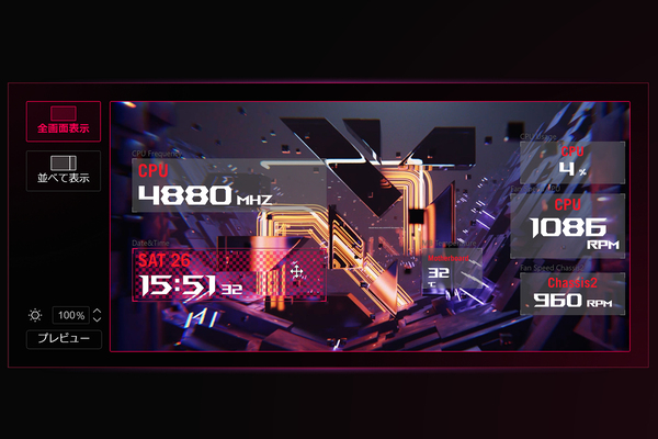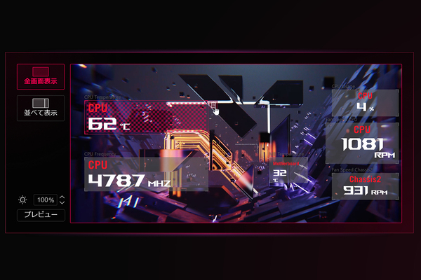 デフォルトで選べる表示映像のプリセットは4種類で、その映像を背景にCPU、GPUの温度やファン回転数などのシステム情報を、手軽に表示できる。