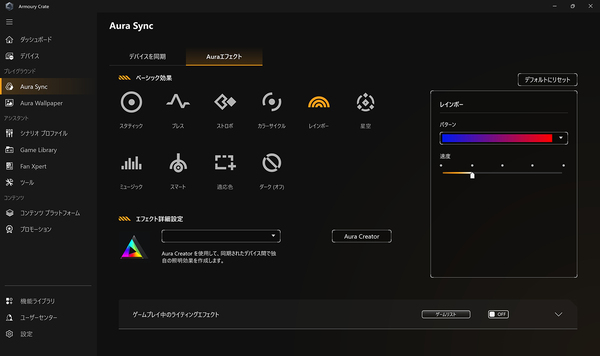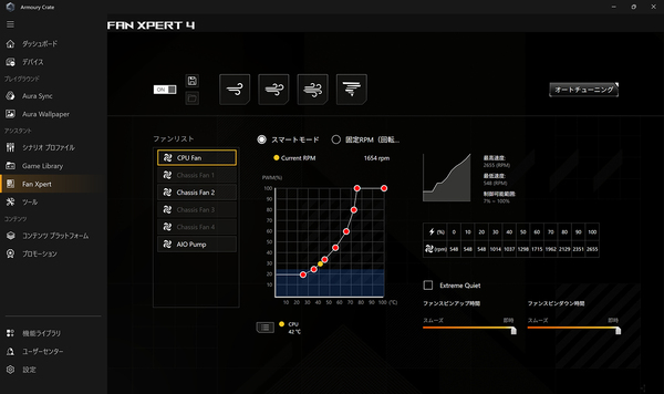 ラジエーターファンのLEDイルミネーションとファン回転数は、ASUS総合ユーティリティ「Armoury Crate」経由で制御できる。