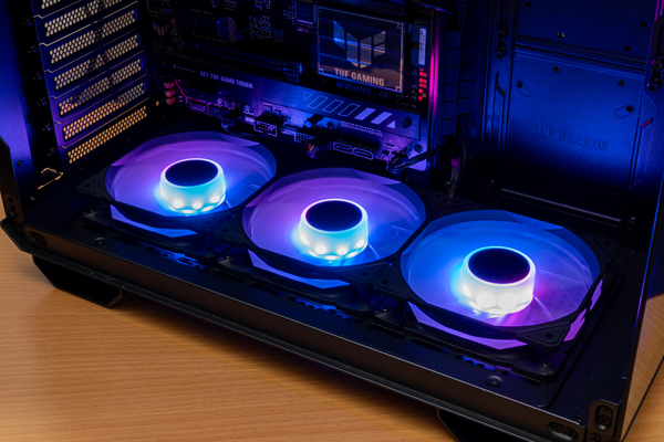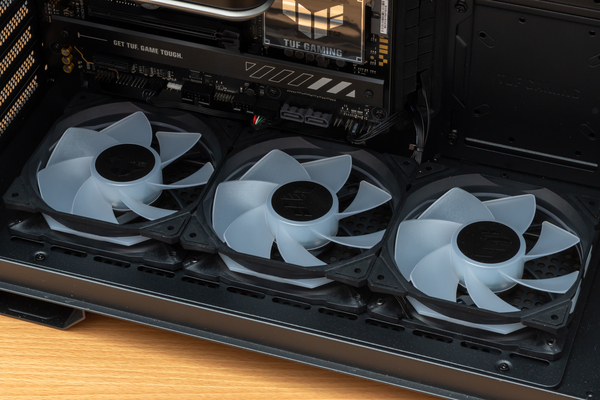 ピラーレスで個性を際立たせるための鉄板パーツとなるARGBファンには、ファンブレードが逆向きになっている「TUF Gaming TR120 ARGB Reverse Fan」3基と、スタンダード回転の「TUF GamingTR120 ARGB Fan」×1基を採用した。