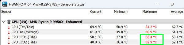 32スレッドがフルロードされる「CINEBENCH 2024」を実行すると、CPU温度(HWiNFO64 Pro)は最大83.4度を記録していた。「Multi Core」のスコアも2244 ptsと、Ryzen 9 9950Xのパフォーマンスを最大限に発揮できている。