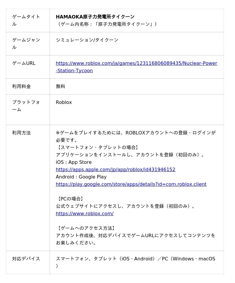 株式会社ARROVA(以下ARROVA)は株式会社EbuActionの協力のもと、世界的に人気のオンラインゲームプラットフォーム「ROBLOX(ロブロックス)」に、中部電力株式会社の浜岡原子力発電所をモデルにしたオリジナルゲーム「HAMAOKA原子力発電所タイクーン」を2025年7月28日(月)に公開いたします。