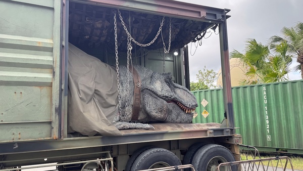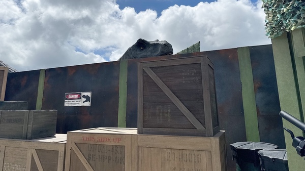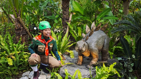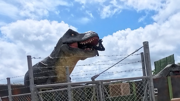 主要アトラクションのひとつで、筆者がいちばん楽しめたのは「ダイナソーサファリ」(体験時間:約17分)でした。巨大生物が脱走した設定で、ゲストは熟練ドライバーが運転する大型オフロード車に乗り込み、18頭もの恐竜が生息するジャングルへと潜入。約20mの巨大なブラキオサウルスや、全長約11.6mのT-REXに遭遇し、アップダウンのある悪路をオフロード車に乗って猛スピードで逃走するのですが、ナビゲーターの熱い演技もあいまって、ハラハラドキドキの興奮が味わえました!