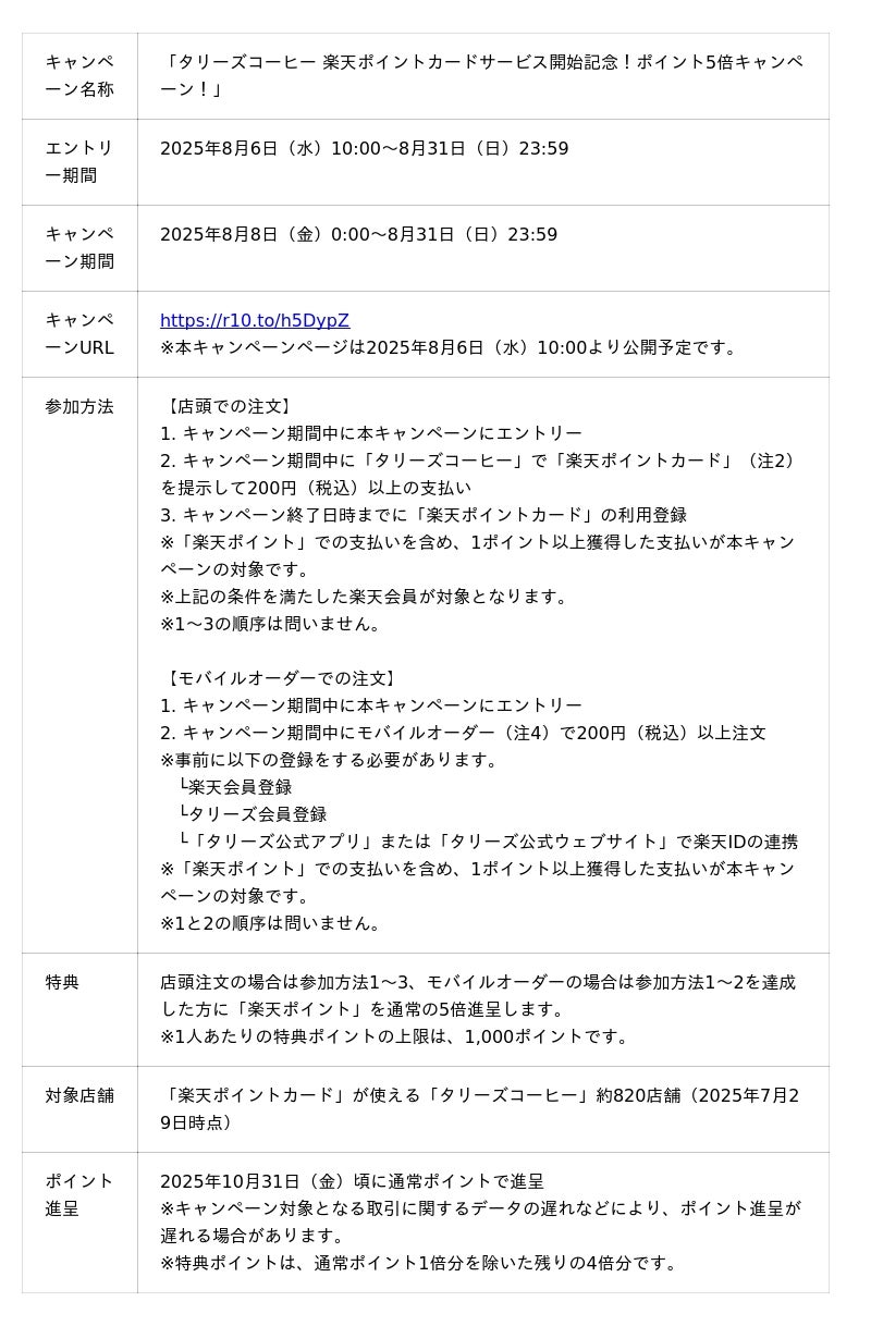 本導入を記念して、2025年8月8日(金)から8月31日(日)まで、「タリーズコーヒー 楽天ポイントカードサービス開始記念!ポイント5倍キャンペーン!」を実施します。