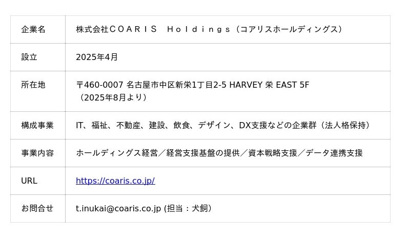 2025年4月、地域・業種・規模の異なる中小企業が連携する新たな共創型ホールディングス「株式会社コアリスホールディングス(以下、コアリスHD)」が始動しました。本体制では、不動産、医療福祉、建設、飲食、IT、クリエイティブ、DX支援など多業種の企業が参加し、法人格・ブランドを維持しながら、ホールディングス本部が統合支援と金融戦略を担います。初年度から年商40億円規模を見込み、6年以内の上場を視野に入れる実行型経営モデルとして注目されており、今後は全国5拠点への支社設置や地域商工会・金融機関との共創を進め、持続可能な分散型経済の実現を目指します。
