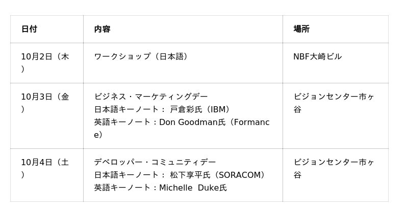 4日はデベロッパー・コミュニティデーと銘打ち、主に開発者コミュニティや個人の経験に基づくセッションが提供されます。日本語のキーノートスピーカーとしてSORACOMの松下氏に登壇いただきます。英語のキーノートはMichelle Duke氏(元GitHub)に登壇いただきます。