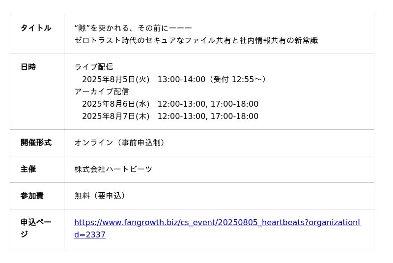 株式会社ハートビーツ(本社:東京都新宿区、代表取締役:藤崎正範、以下「ハートビーツ」)は、株式会社kubellストレージ(本社:東京都港区、代表取締役社長:中 哲成、以下kubellストレージ)との共催にて、ファイル共有に潜む情報漏洩リスクとその対策をテーマにした無料ウェビナーを2025年8月5日(火)に開催いたします。