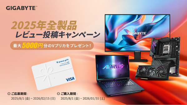 GIGABYTEは、新たなキャンペーン「2025年全製品レビューキャンペーン」を8月1日からスタートすると発表した。期間は2026年1月31日までで、対象製品の購入者がレビューを投稿することで、最大5,000円分のVプリカを受け取ることができるという。