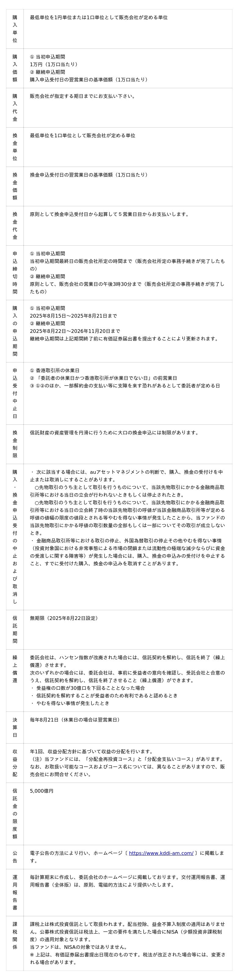 auアセットマネジメント株式会社(本社:東京都千代田区、代表取締役社長:森田 康裕、以下 auアセットマネジメント)は、2025年8月22日に追加型投資信託「auAMレバレッジ・ハンセン・中国ファンド(円コース/香港ドルコース)」(以下 当ファンド)の設定・運用を開始することをお知らせします。