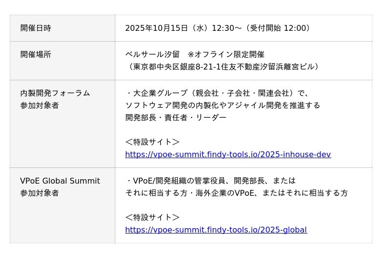 エンジニアプラットフォームを提供するファインディ株式会社(東京都品川区、代表取締役:山田 裕一朗、以下「当社」)は、2025年10月15日(水)にベルサール汐留にて、「内製開発フォーラム」および「VPoE Global Summit」を同時開催します。
