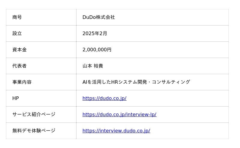 2025年2月設立。より人に近く、より安心できるAIの在り方を追求しながら、「高精度アバターによるAI面接サービス」をはじめとした人事・採用活動を革新するソリューション事業を展開しています。単に従来の手法を自動化するのではなく、人とAIの共存価値を高めることで、企業の人事・採用領域における課題解決や業務効率化にコミットします。