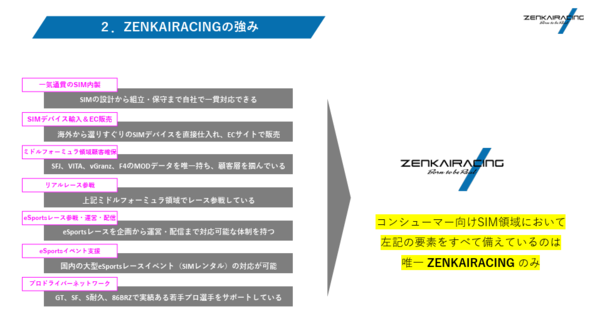 Fanatecと正規代理店契約を締結したゼンカイレーシングは、レーシングシムに特化したプロフェッショナル・ビルダー。DIYからスタートしたという同社だが、現在ではドライビングシムの開発、ECでのデバイス販売、イベントサポート/eSportsレース運営など、多岐にわたって展開している。