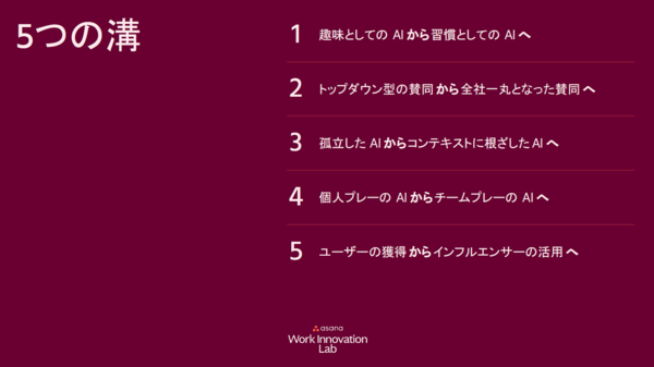 今回、Asanaのワークイノベーションラボが日本全国のナレッジワーカー2000人以上に調査したところ、AIを組織にインストールするためには5つの超えるべき溝(キャズム)があることがわかったという。