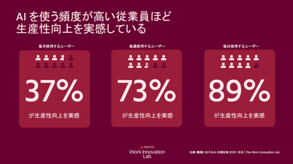 調査によると、AIを使う頻度が高い従業員ほど、生産性の向上を実感しているという。毎月使うユーザーが37%なのに対して、毎週使用するユーザーは73%、毎日使用するユーザーは89%が生産性の向上を実感しているとのこと。「たまに使うのでは意味がない。趣味としてではなく、習慣化しなければならない」(ホフマン氏)
