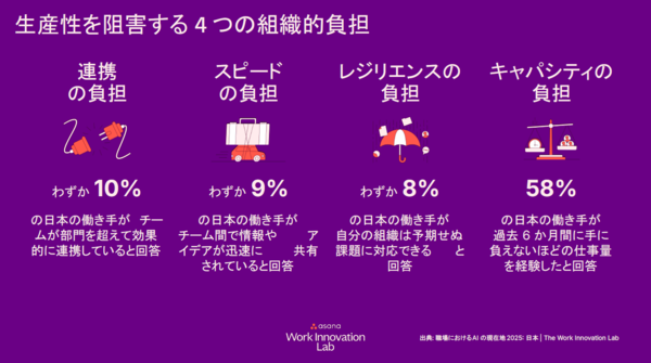 日本のビジネスパーソンの35%は、自分の組織の働き方を時代遅れであると回答している。そして、生産性を阻害する要因としては、「部門を超えた効率的な連携が欠けている」「チーム間での情報やアイデアの共有が行なわれていない」「予期せぬ課題への対応ができない」「手に負えないほどの仕事量を抱えてしまうキャパシティの不足」などが大きな課題になっているという。