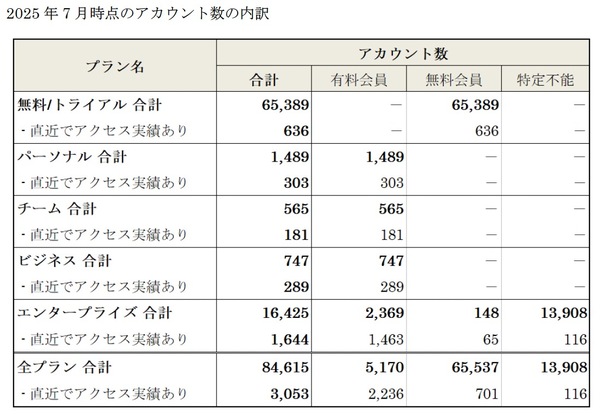 同社は2014年に設立され、AI議事録自動作成ツール「AI GIJIROKU」などで知られるAIベンチャーだ。しかし、同社が7月29日に公表した第三者委員会の調査報告書により、売上の大半が架空計上であった衝撃的な実態が明らかになった。報告書によると、2024年12月期の有価証券報告書で2万8699件と記載されていた有料アカウント数は、2025年7月時点の調査で、実質的な有料会員はわずか5170件、さらにそのうち直近でアクセス記録があったのは2236件だったことが判明した。エンタープライズプランの約1万4000アカウントは有料か無料か特定不能とされているが、報告書は「その大多数は無料会員であることが推察される」と指摘している。