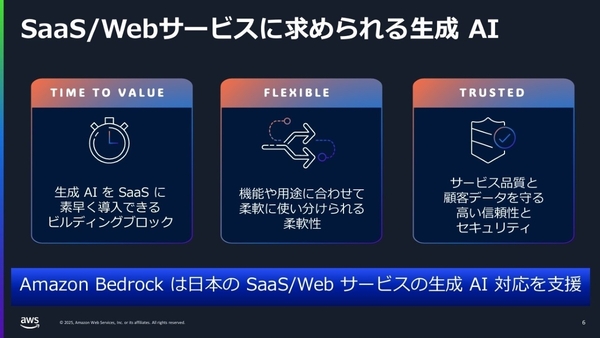 こうした企業に対してAWSは、「Amazon Bedrock」を中心とした生成AI関連サービスを提供している。佐藤氏は、これらのサービスがSaaSベンダーに提供する価値として、素早く生成AIを組みこめる豊富な機能、様々な基盤モデルにアクセスでき、用途に応じて使い分けられる柔軟性、そして、サービス品質と顧客データを守る高い信頼性とセキュリティを挙げた。