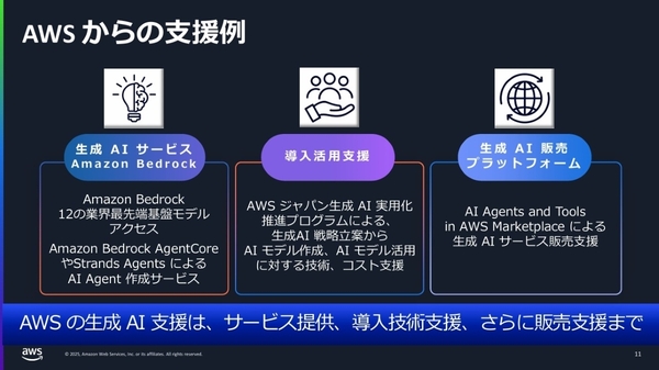 現在、AWSが注力しているのが、AIエージェントの実装支援だ。2025年7月にエージェント構築のために必要な“機能の集合体”である「Amazon Bedrock AgentCore」のプレビューを一部地域で提供開始(参考記事:AWSジャパンが、AIエージェントの部品集「Bedrock AgentCore」と仕様駆動型IDE「Kiro」を解説)。導入技術支援として、日本独自の施策である「生成AI実用化推進プログラム」を展開する。