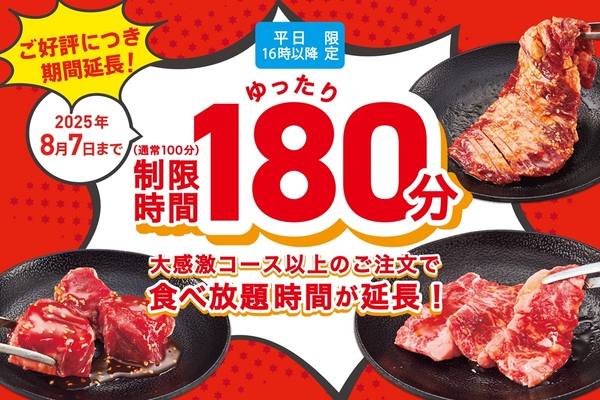 じゅうじゅうカルビでは、バイキング形式の焼肉食べ放題を提供しています。食べ放題は通常100分制ですが、7月1日~31日の期間、平日16時以降限定で、制限時間を延長するキャンペーンを実施していました。これが好評だったことから、8月7日まで継続されます。