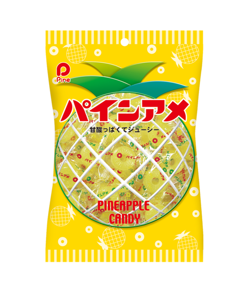 「パインアメ」は昭和26年にパイン社より発売され、幅広い世代に愛され続けてきた甘酸っぱくてジューシーな味わいのキャンディ。