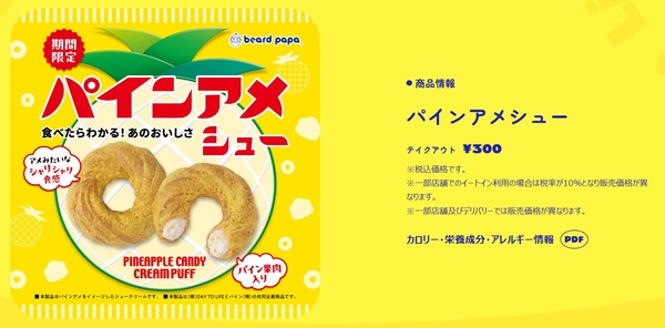 シュークリーム専門店「ビアードパパ」は、8月1日より「パインアメシュー」(300円)を期間限定で発売する。