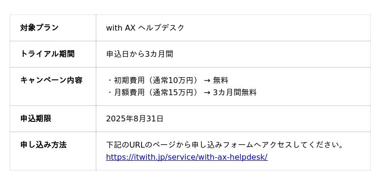 PSソリューションズ株式会社(本社:東京都港区、代表取締役社長:村松佑樹)は、2025年4月に開始した生成AIチャットボットサービス「with AX ヘルプデスク」のトライアル利用について、初期費用・月額費用が3カ月完全無料になるトライアルキャンペーンの募集を、さらに10社追加します。