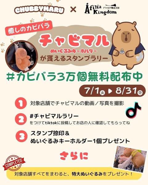 また、今後新たに「#チャビマルラリー」という企画も開催。アフィリア魔法王国の各店舗を巡るスタンプラリーで、参加者はスタンプを集めてぬいぐるみをもらえるという内容だ。さらに、スタンプを7店舗分集めると全長90cmの特大チャビマルぬいぐるみがプレゼントされるという。