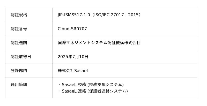 株式会社SasaeL(ササエル、本社:東京都文京区、代表取締役:村中 順紀、以下 SasaeL)は、このたび、開発・提供するクラウド型校務支援システム「SasaeL 校務」と保護者連絡システム「SasaeL 連絡」の2つのサービスについて、クラウドセキュリティの国際標準規格「ISO/IEC 27017」認証を取得いたしましたことをお知らせいたします。
