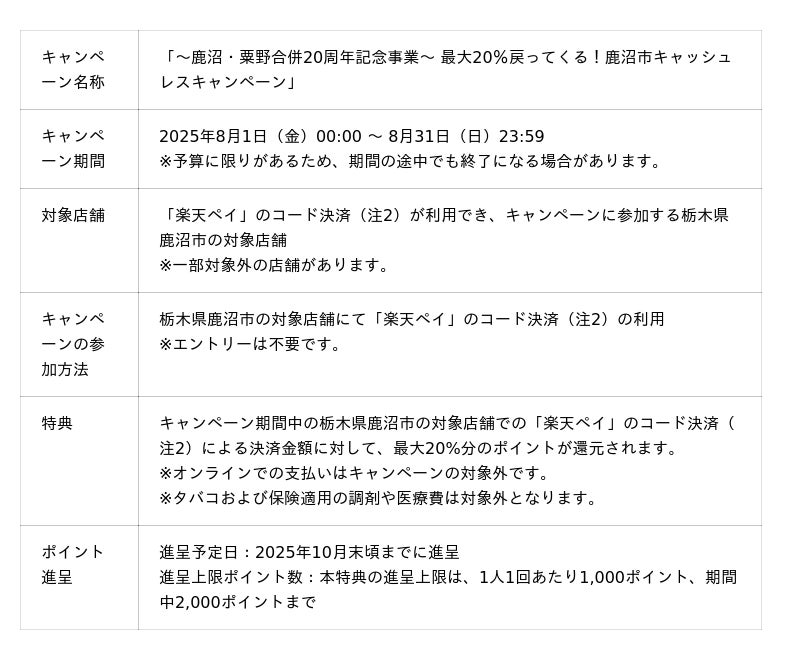 楽天ペイメント株式会社(以下「楽天ペイメント」)は、運営するキャッシュレス決済サービス「楽天ペイ」において、栃木県の鹿沼市キャッシュレスキャンペーン実行委員会が2025年8月1日(金)から8月31日(日)まで実施する「~鹿沼・粟野合併20周年記念事業~ 最大20%戻ってくる!鹿沼市キャッシュレスキャンペーン」に参加することをお知らせします。