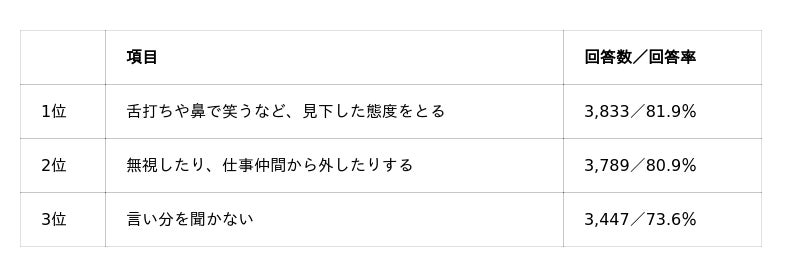 ハラスメントの『芽』となるインシビリティな言動。最も多くの人が「インシビリティだ」と感じるのは、「舌打ちや鼻で笑うなど、見下した態度をとる」言動という結果に。
