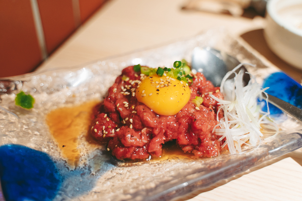 最初は「がむしゃらナムル」から。もやし、ほうれん草、人参、ぜんまいの4種類が豪快にミックスされていて、ゴマ油の風味と程よい塩加減。お肉を焼き始める前の準備運動的なおつまみとして頼んでおきたい一皿です。続いて「特製ユッケ」。生卵を割ると黄身がとろ~り流れ出し、赤身の上で艶やかに光ります。細切りにされた和牛赤身は一片一片が思ったより大きめで食べ応え十分。暑い季節でもするりとお腹におさまります。