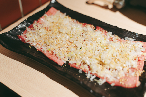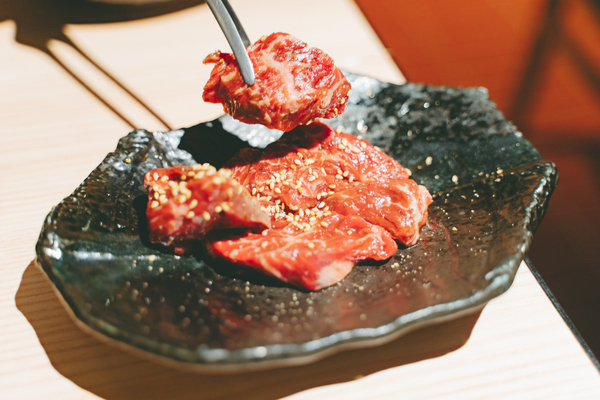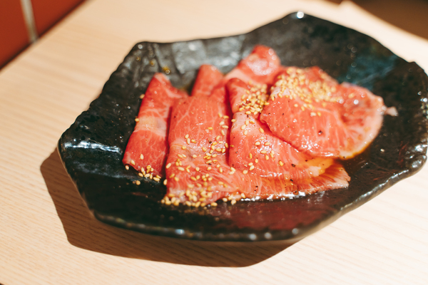 代わりにオススメされて注文したのがミスジ。ミスジは牛の肩甲骨周辺の希少部位で、1頭からわずか数kgしか取れない高級部位ですが、この日は運よく提供がありました! お肉は一枚一枚が大きく贅沢な存在感。焼き上がりは霜降りの脂がじゅわっととろけるように柔らかく、口いっぱいに甘みが広がったかと思うと、ものの数秒でとろけて消えていきます。余韻まで美味しい最高級の赤身肉に翻弄されてしまいました・・・!