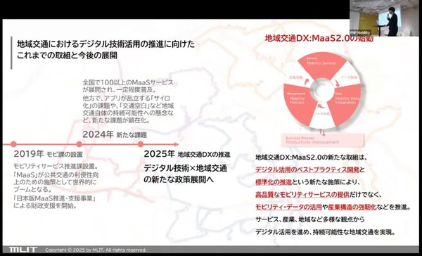 また、これまで各地で取り組んできたMaaS事業の振り返りとして、「技術的な課題はおおむね解消されてきているが、持続可能な地域交通の実現には、交通モードを横断した地域全体での計画・評価と、地域社会と連携した施策の実施が不可欠」と指摘した。