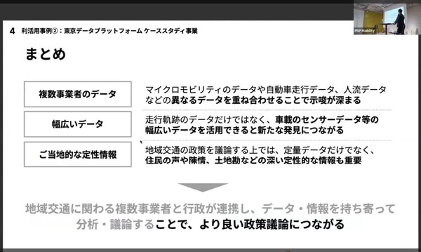 牧田氏は、「行政や事業者が持つデータを持ち寄ることで、政策につながる多様な気づきが得られる」と語り、マイクロモビリティのデータが今後の交通政策やまちづくりに果たす可能性を示した。
