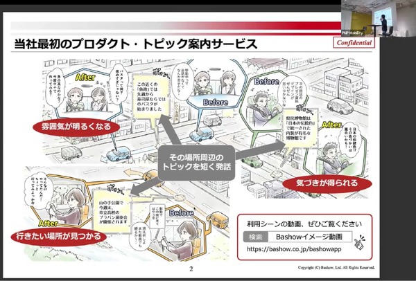 「Bashow」は、Web上の情報からAIが自動でトピックを生成。場所や日時、天候のほかユーザーの情報も加味し、AIが案内のタイミングを判断して情報を提供する。ユーザーからの反応をもとに強化学習を繰り返し、継続的に進化していくという。「Bashow」は「目的地への効率的な移動」ではなく、「寄り道を楽しませる」ことで地域の魅力に触れる機会を創出することを重視している。