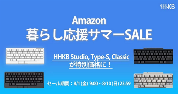 PFUは、2025年8月10日(日)23時59分までHHKB Amazon暮らし応援サマーSALEを実施中。HHKB Studio、HHKB Professional HYBRID Type-SそしてHHKB Professional Classicの対象機種がそれぞれお買い得となっている。