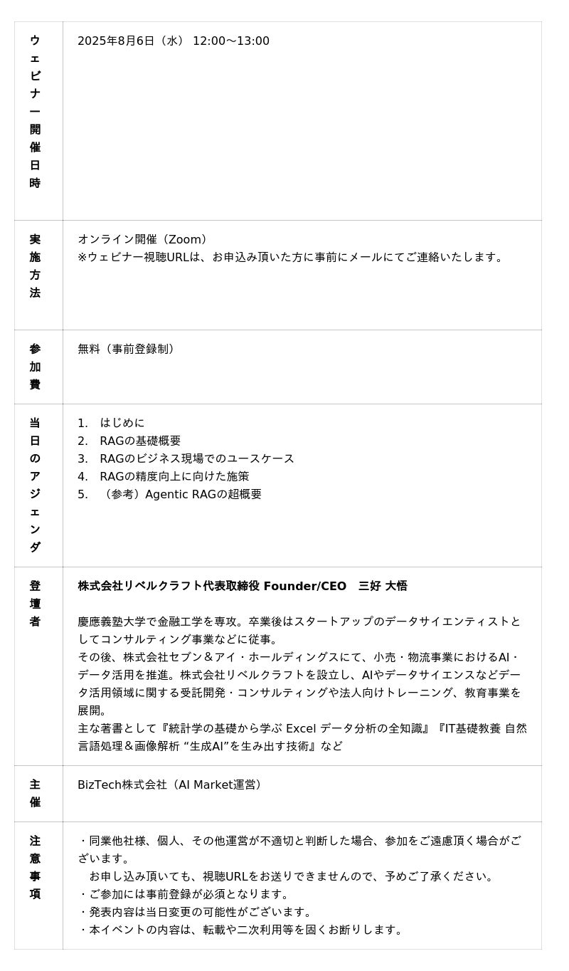 AI Market(https://ai-market.jp)は、2025年8月6日、「プロが教えるRAG精度向上5メソッド ~すぐに使える即効テクを大公開~」ウェビナーを開催します。