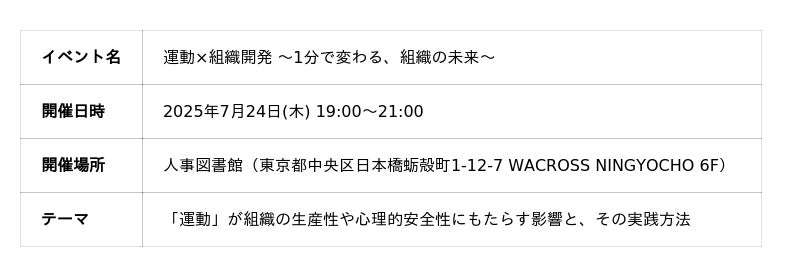 株式会社Trustyyle(本社:東京都中央区・代表取締役:吉田洋介)は、2025年7月24日に、運営するコミュニティ「人事図書館」にて『運動×組織開発 ~1分で変わる、組織の未来~』を開催しました。株式会社リィの羽田孝氏による「運動と組織開発」に関する講演や参加者全員での体験セッションが行われ、盛況のうちに終了しました。本記事では、イベント当日の様子や成果についてご報告します。