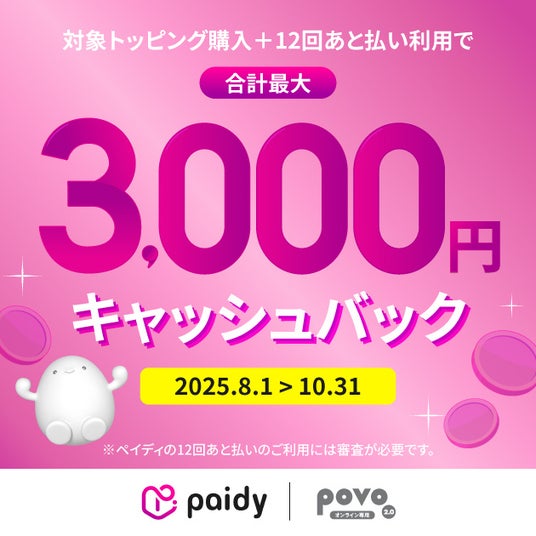 KDDI、沖縄セルラーは2025年8月1日から10月31日まで、povo2.0のお支払い方法として、株式会社Paidyが提供するあと払いサービス「ペイディ」の「6回あと払い」「12回あと払い」を追加します。