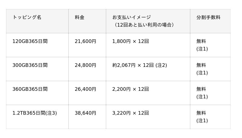 6・12回あと払いいずれも分割手数料無料(注1)でご利用可能です。おトクな1年間トッピングを12回払いとすることで、月々の支払い負担を軽減してご利用いただけます。