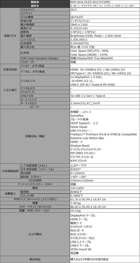 ROG Strix OLED XG27UCDMG:https://rog.asus.com/jp/monitors/27-to-31-5-inches/rog-strix-oled-xg27ucdmg/